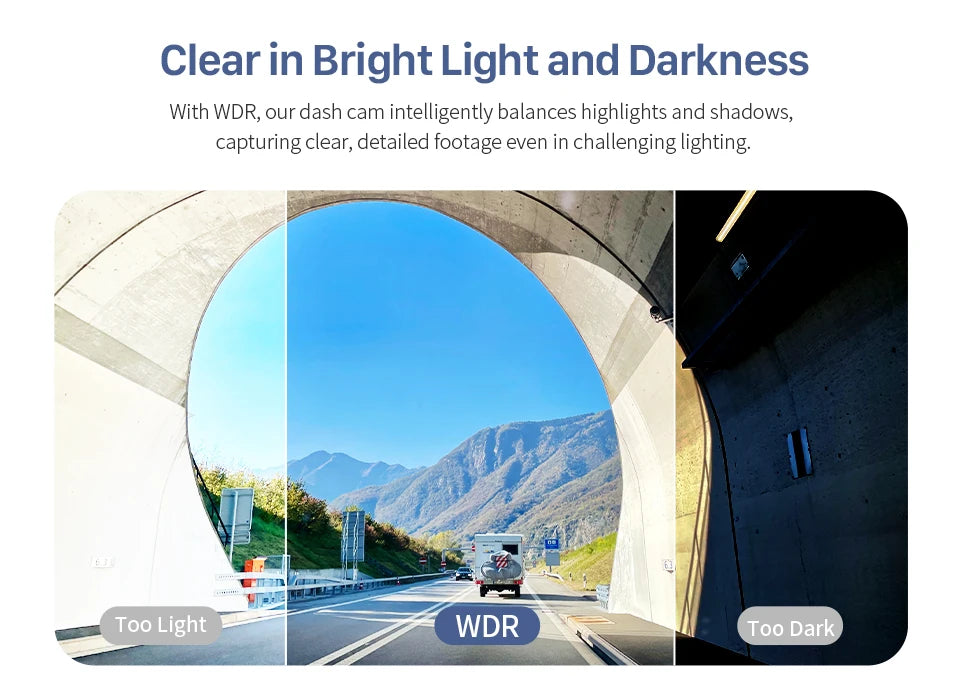 With Wide Dynamic Range (WDR), our dash cam intelligently balances highlights and shadows, capturing clear, detailed footage even in challenging lighting.