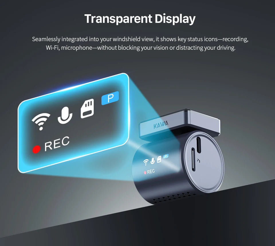 Seamlessly integrated into your windshield view, it shows key status icons—recording, Wi-Fi, microphone—without blocking your vision or distracting your driving.