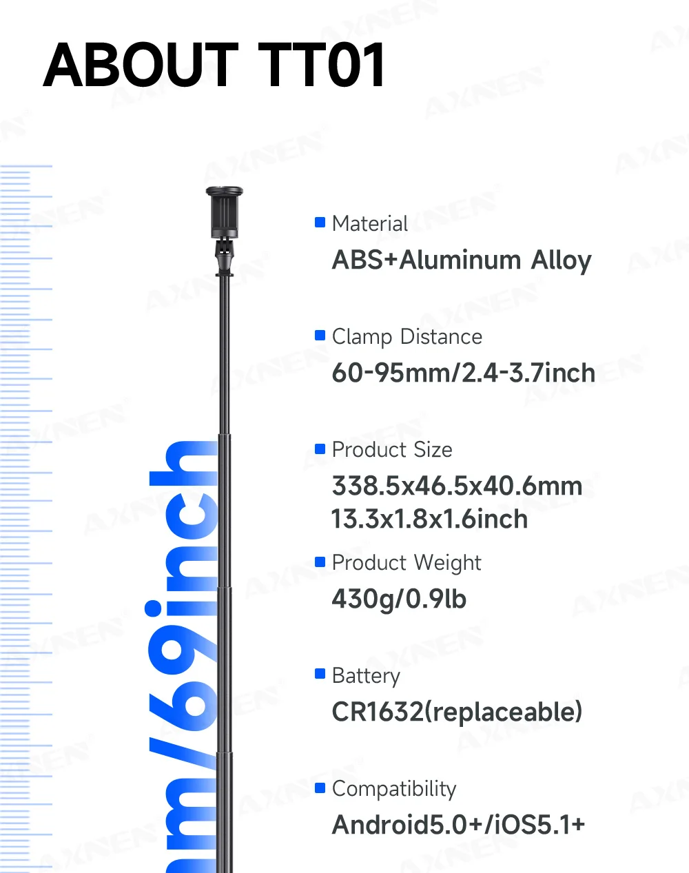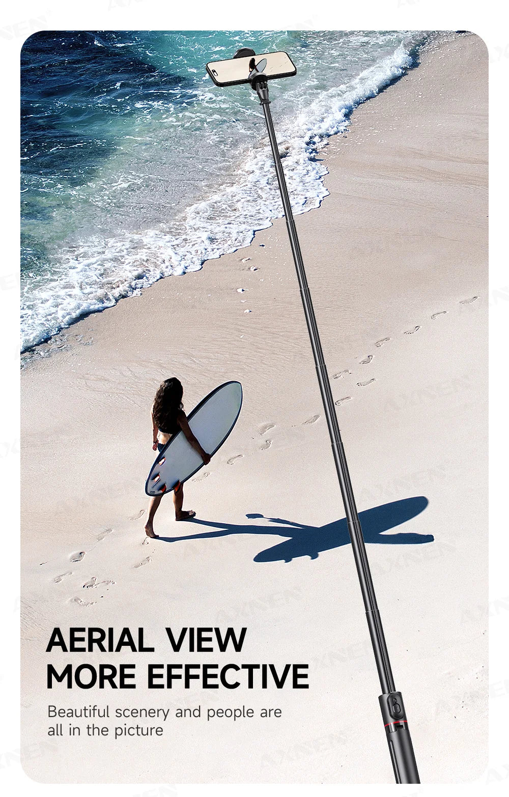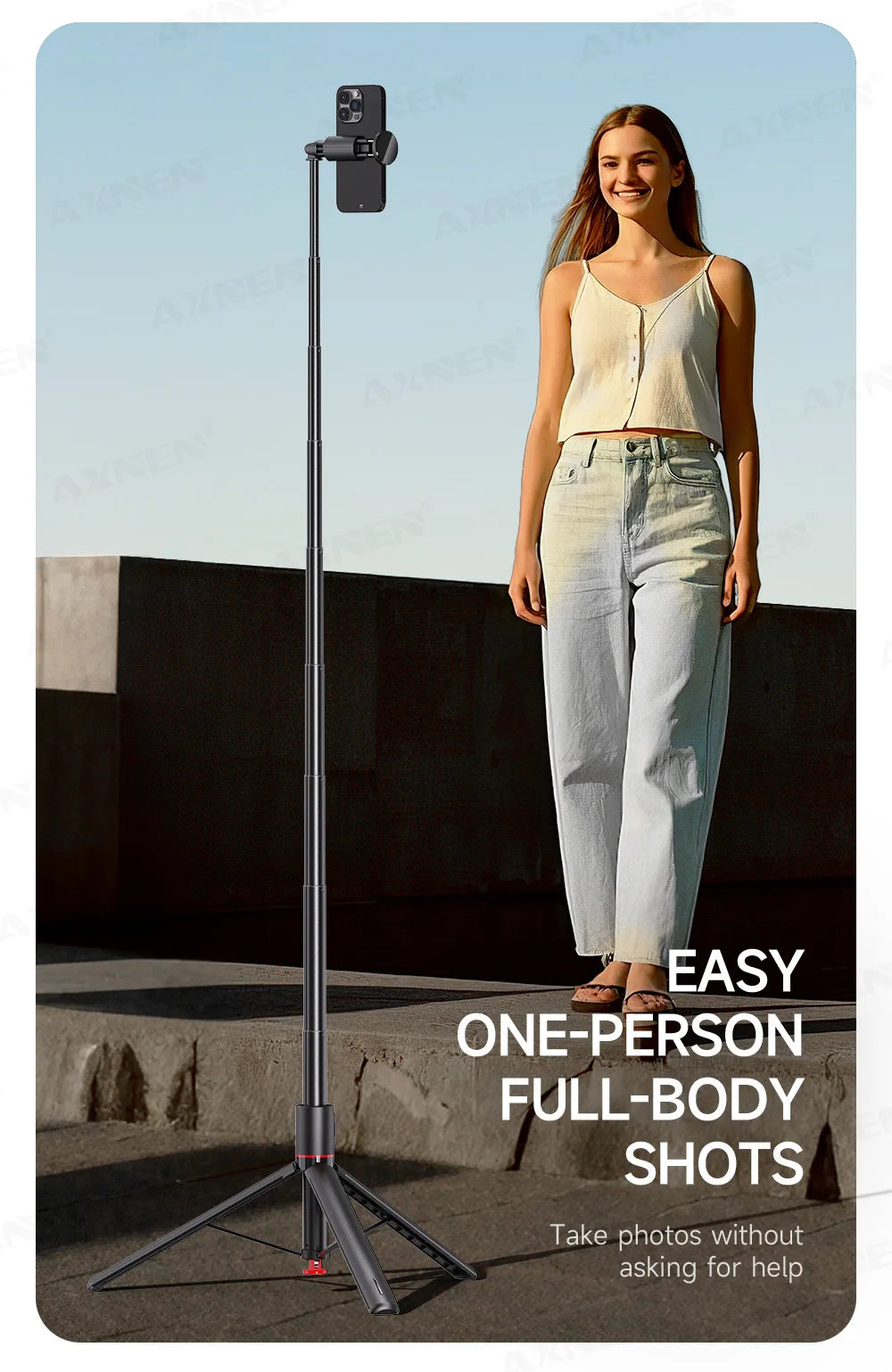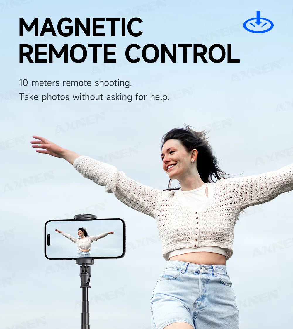 The TT01 Auto Pop-Up Selfie Stick combines innovation and portability — with an automatic tripod that opens on contact, a detachable magnetic Bluetooth remote, and a super-long 1.77m aluminum alloy rod.