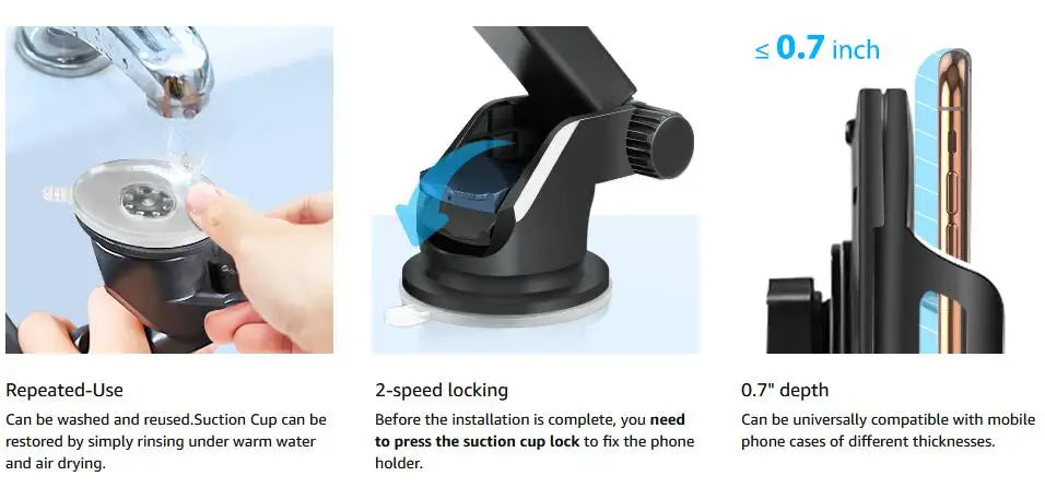 Strong Suction Cup with Sticky Gel This car mount for phone, its super-strong suction cup, the mount is able to adhere not only to a smooth surface but also attach itself firmly to some textured surface yet is still easily removable.