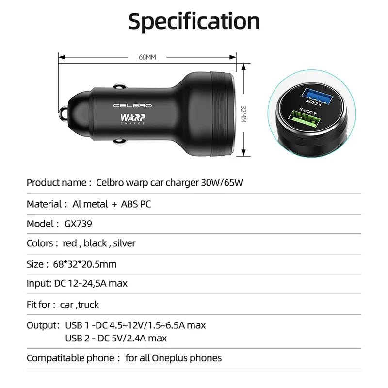 Upgrade your charging experience with the CelBro® Oneplus 65W Warp Charge 30W Car USB Phone Charger. Stay charged and connected wherever you go. Get yours today!