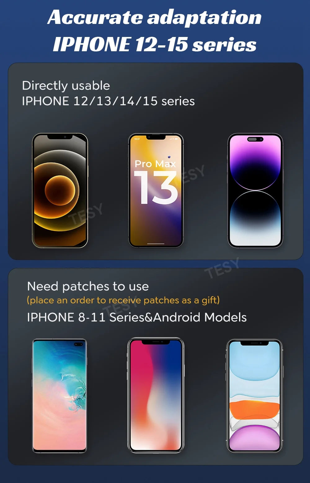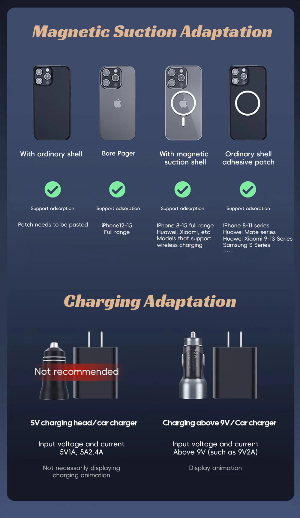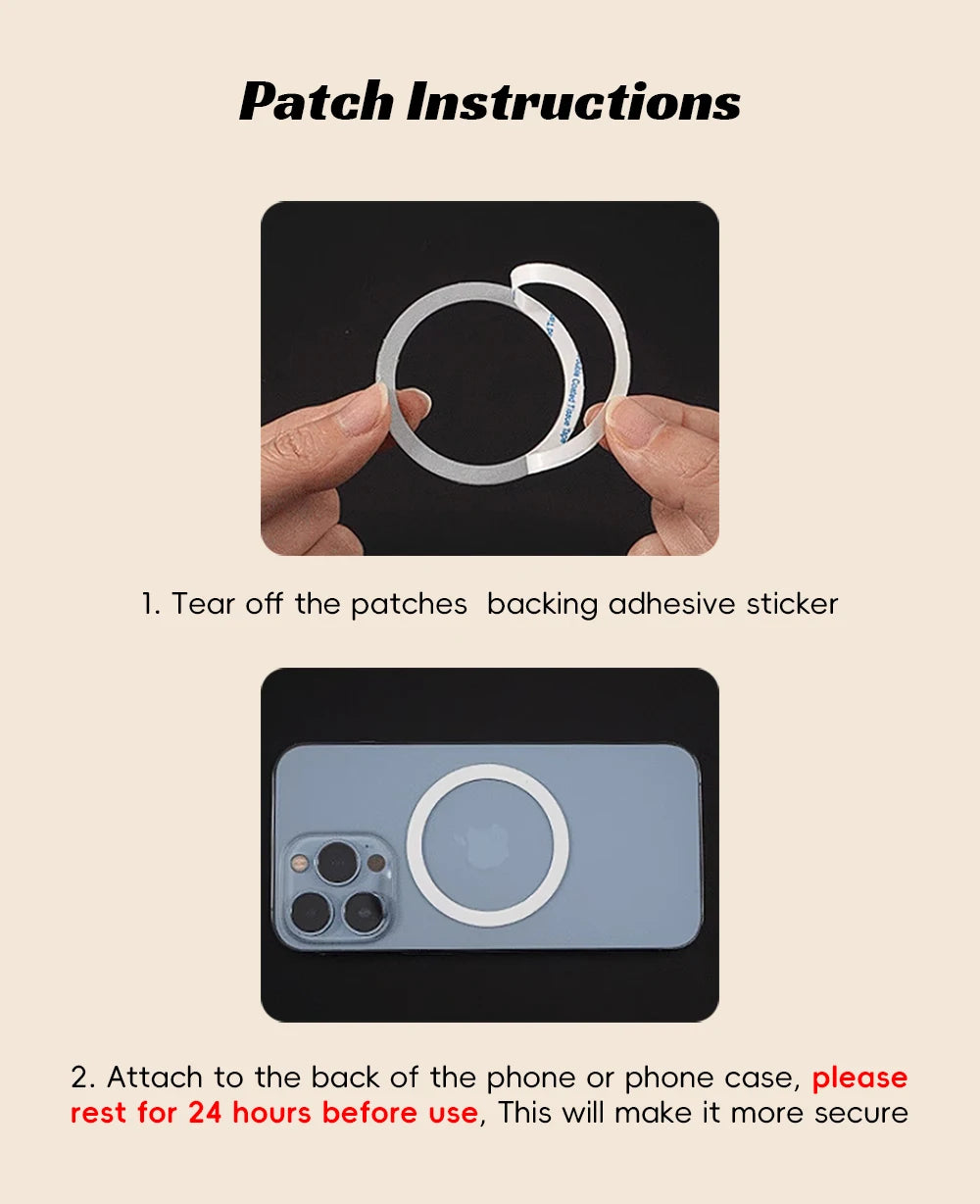 Supported Phone Types - Apple models from iPhone 12 and above support MagSafe, no need for additional magnetic plates. Universal installation for Apple devices, magnetic plates included as a gift.