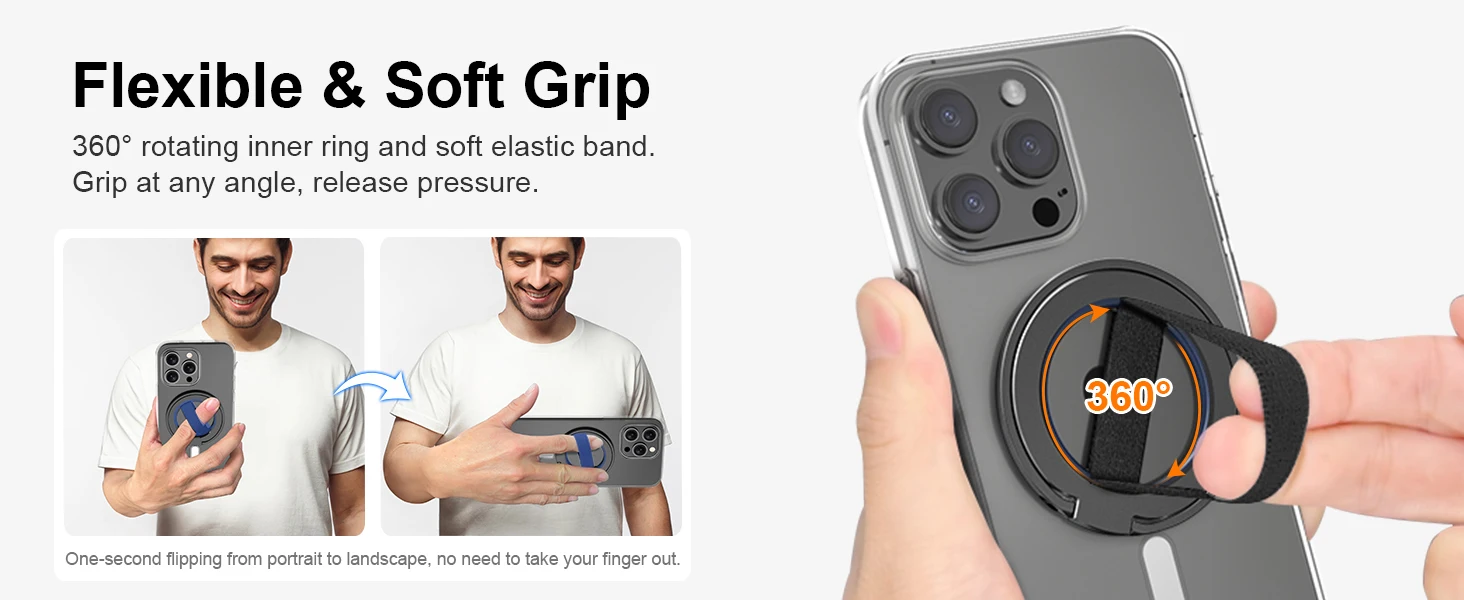 【Double 360° Rotation】 MagOne Ultra phone grip has a rotatable outer and inter ring for smooth 360° rotating. Multi-angle adjustment provide your with best viewing angle and flexible & comfortable hand grab experience without uncomfortable pain.
