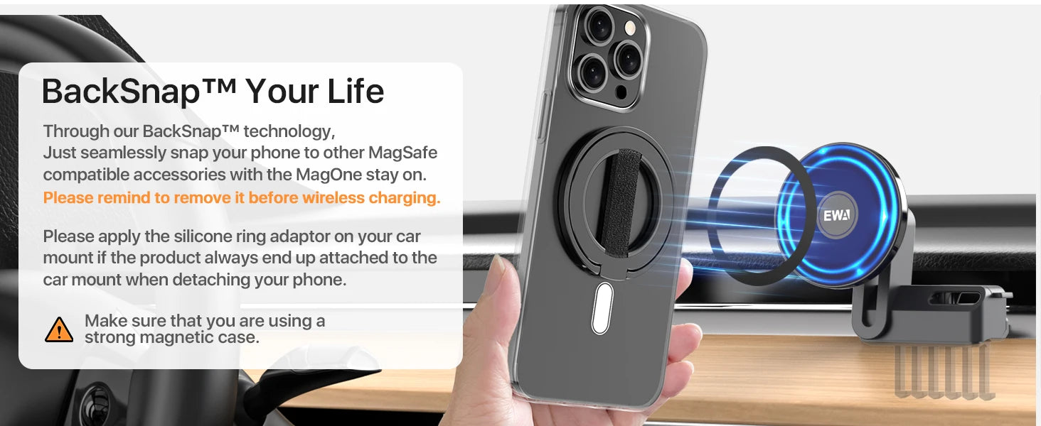 【Magnetic Snap Bridge】 With the BackSnap, you can also snap to other Magnetic accessories with the ring stay on phone, like Apple Wallet, wall mount, car mount. Please apply the silicone ring adaptor on your car mount if the product always end up attached to the car mount when detaching your phone. (Warning: Please make sure to use this product with a magnetic phone case when using on car mount.) Please remind to remove MagOne Ultra with a slide before wireless charging.