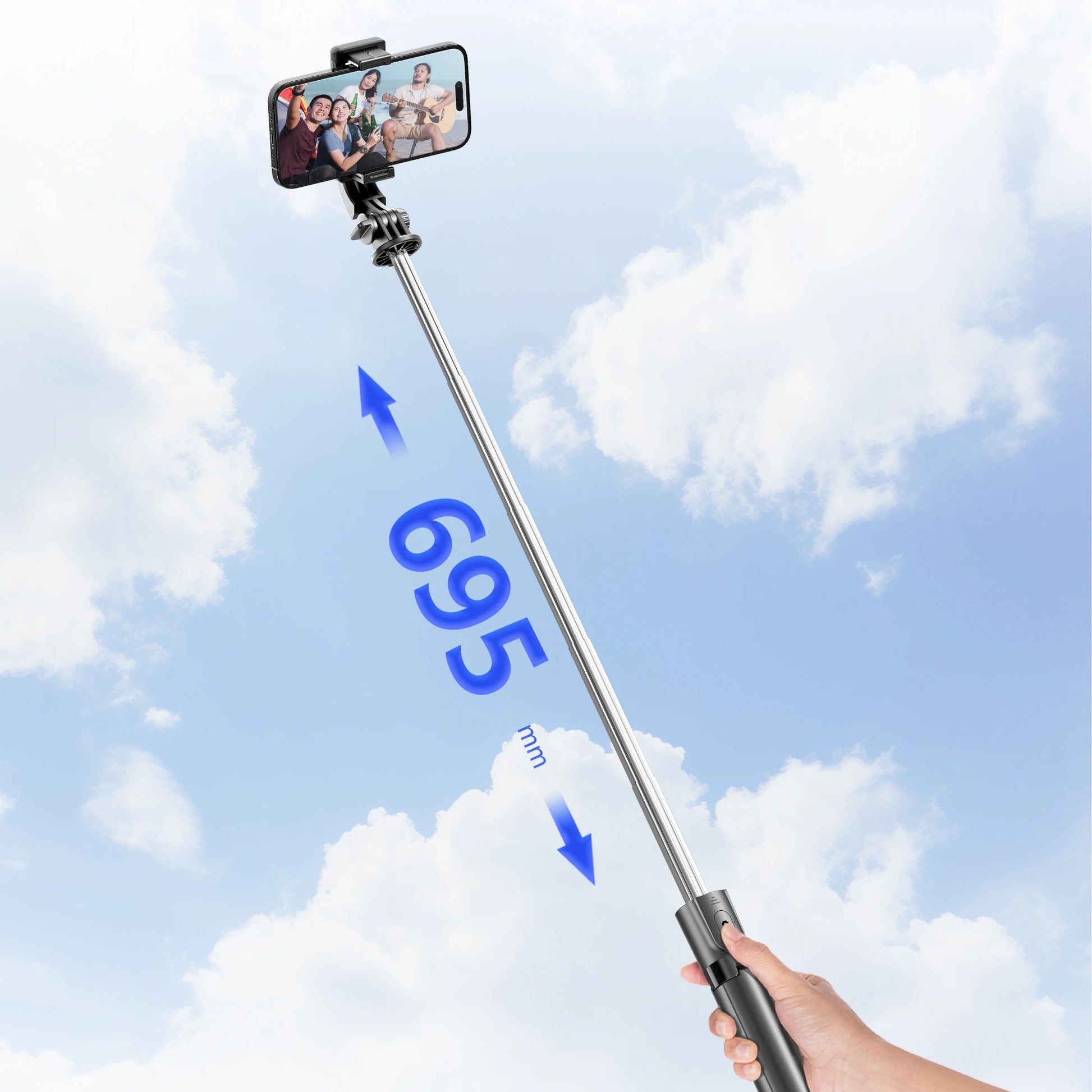 This selfie stick tripod combines portability and versatility in a sleek design. It is compatible with smartphones and action cameras, allowing you to capture high-quality photos and videos with ease. Featuring a 6-section extendable pole, 360° rotation, a detachable Bluetooth remote, and a lightweight design, this selfie stick is perfect for any occasion.