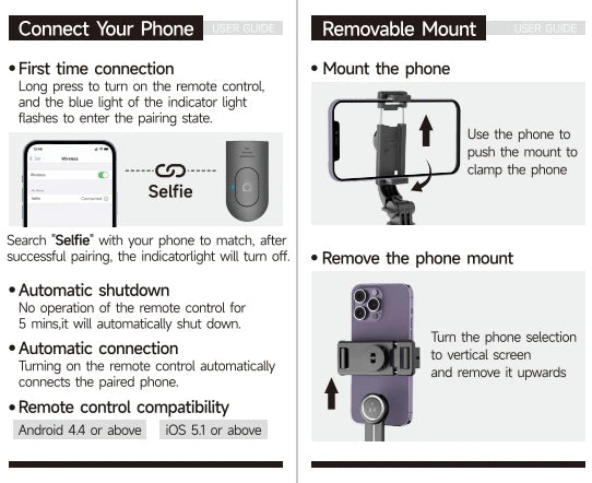 - Detachable Design: The phone holder and Bluetooth remote are detachable, making it easy to carry and saving space.
