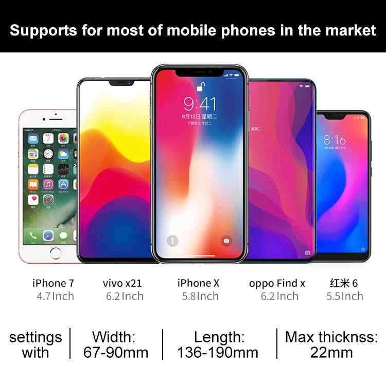 Size of mobile phone that can be clamped: width 69-93mm, height 137-212mm, thickness 21mm