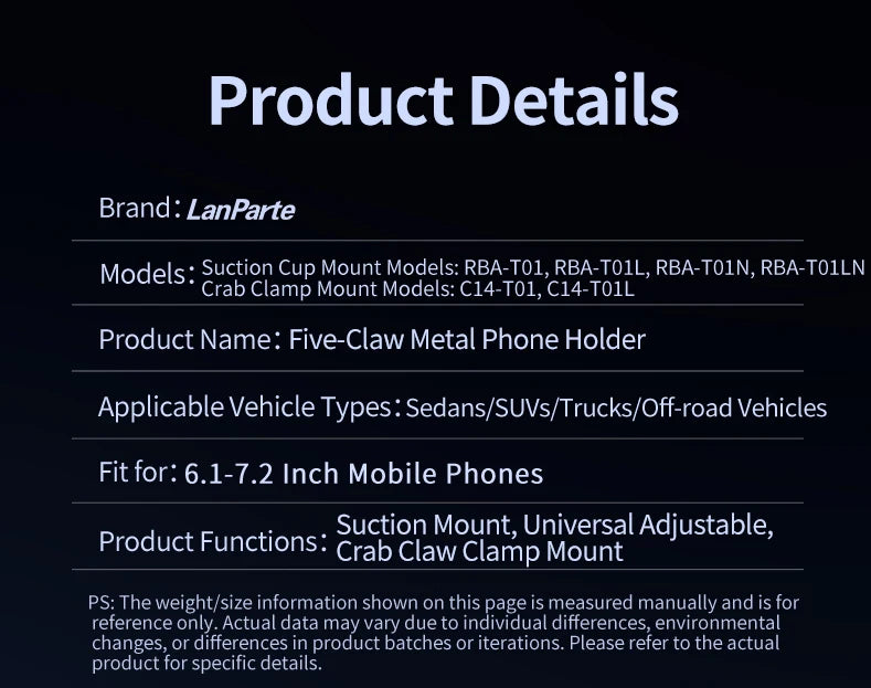Introducing the VBNM Five Claw Metal Vacuum Adsorption Car Phone Holder Bracket, the perfect solution for securely mounting your phone in your off-road vehicle. This sturdy and stable holder is designed to accommodate phones ranging from 6.1 to 7.2 inches, ensuring a perfect fit for most modern smartphones.