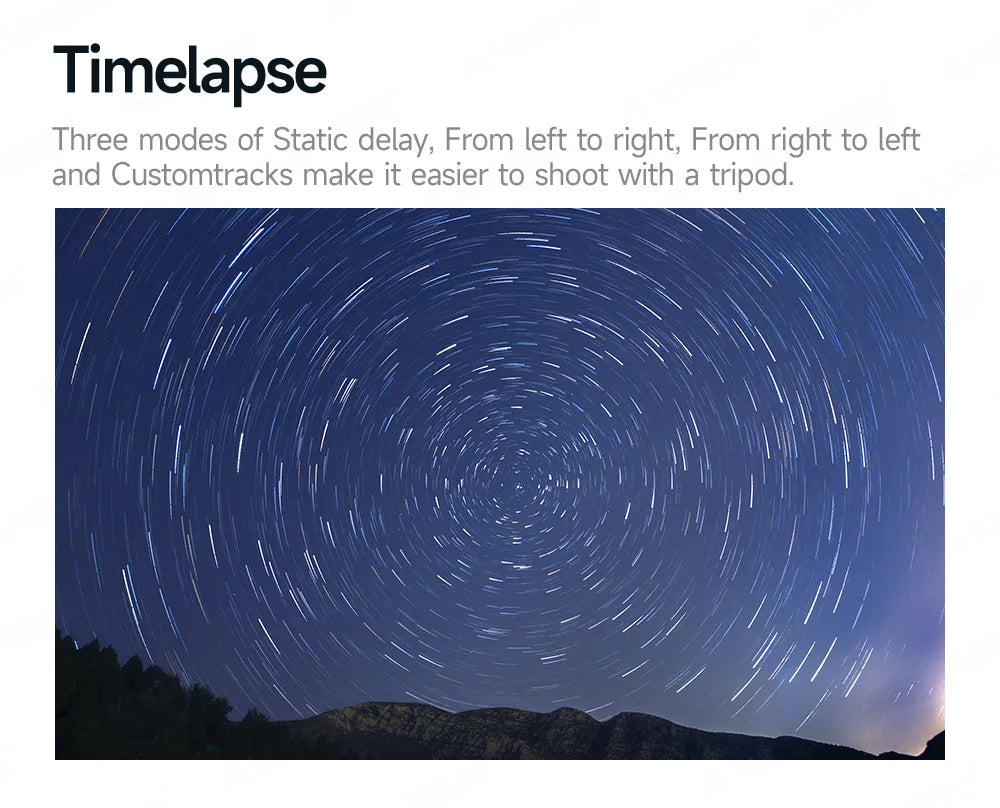 Static, Left to Right, Right to Left, and Custom Tracks for easy tripod shooting