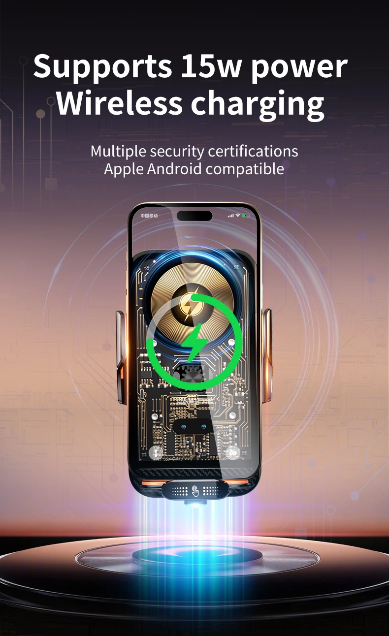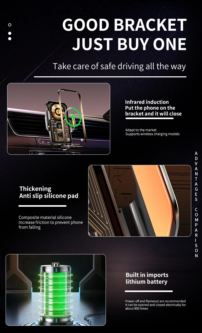 [Automatic Clamps ] This car wireless charger is equipped with infrared sensing technology. When the phone is close to the stand or wave the palm in front of the stand, the phone holder will automatically open, you can easily place the phone, and then the stand will automatically clamp the phone..In addition, there are two touch switches set on the front and back of this phone holder. With the touch of a switch, you can also easily use this stand.