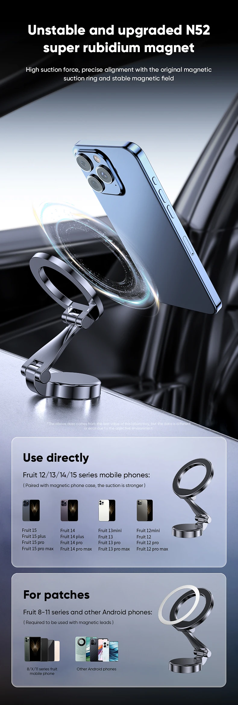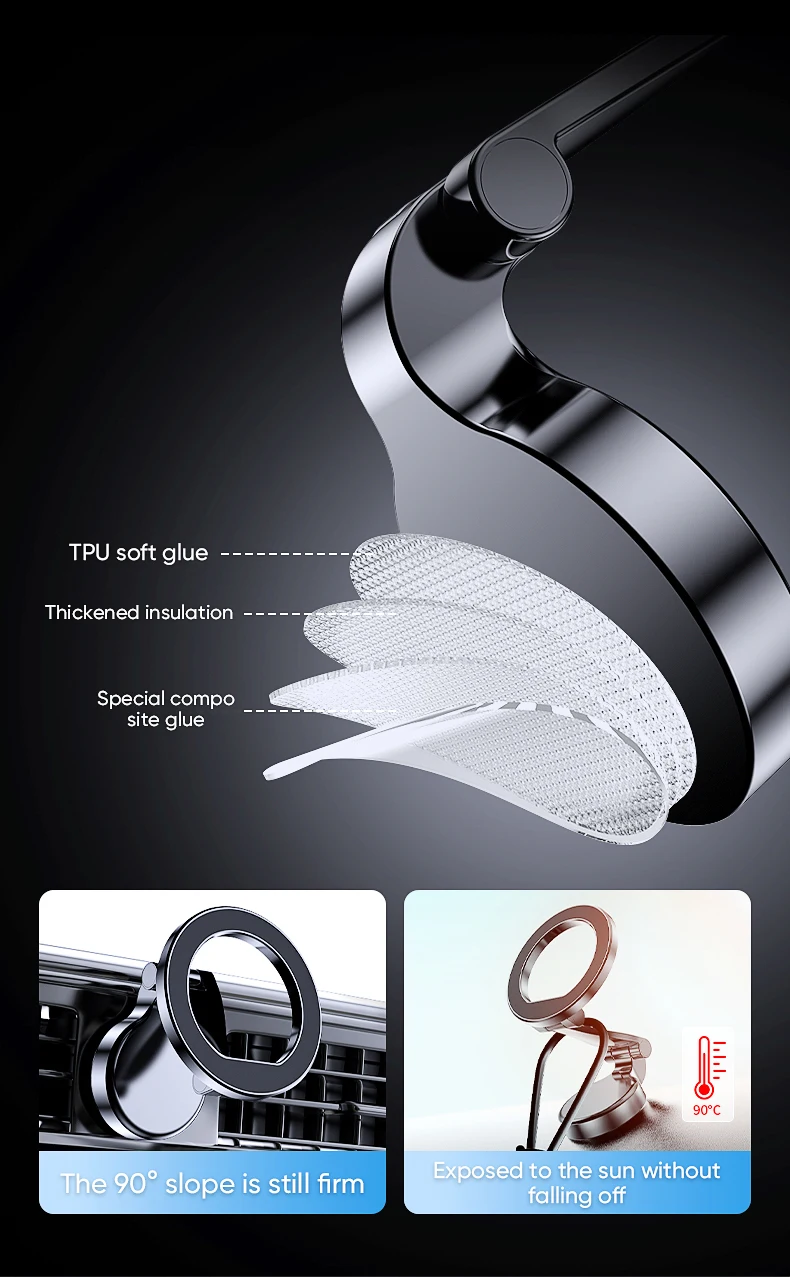 The car phone holder mount adopts a ring magnet array, super strong magnetic force, it can also hold your smartphone firmly. The magnetic car mount is suitable for Magsafe mobile phone case, which can be automatically positioned to match with the built-in magnetic module for Iphone, keeping the mobile phone stable while driving.