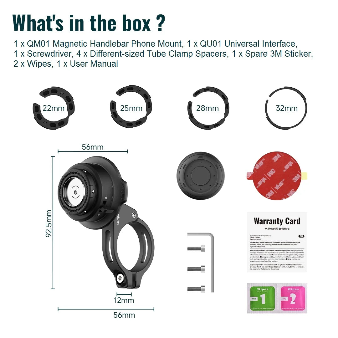 Wide Compatibility This universal motorcycle phone mount can fits all smartphones, like iPhone 16/ 15/ 14/ 13/ 12 Pro Max, iPhone 16 Pro, iPhone 16/ 15/ 14 Plus, iPhone Xs, Xs Max, Samsung Galaxy S24/S23/S22 ultra, S21, S20, Google Pixel, Huawei, Xiaomi and more. Moreover, the phone mount is equipped with 4pcs different-sized tube clamp spacers to make it fit most motorcycles, bikes, Ebikes, and scooters handlebars from 22-32mm, even installed on 35mm handlebars without a spacer.