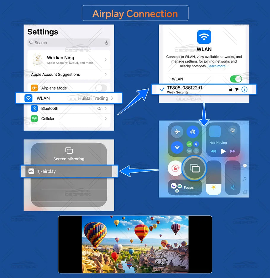 A: Select the device Airplay, open the mobile WIFI, connect the device's WIFI, scroll down the phone settings, and select the device screen mirroring