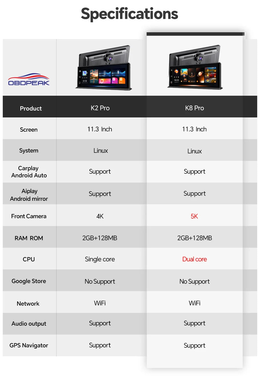 The K8 Pro is equipped with a new generation of intelligent chip platform, high-resolution camera module, and independent image processing chip, achieving industry-leading 5K ultra clear night vision recording. Paired with an 11.3-inch touch screen, the image recording and display effects will definitely not disappoint you. Combined with Carplay and Android Auto, it supports wireless maps and real-time traffic navigation, making operations more convenient and significantly improving user experience. Now, as the most important new product of OBDPEAK-2025, please choose it.