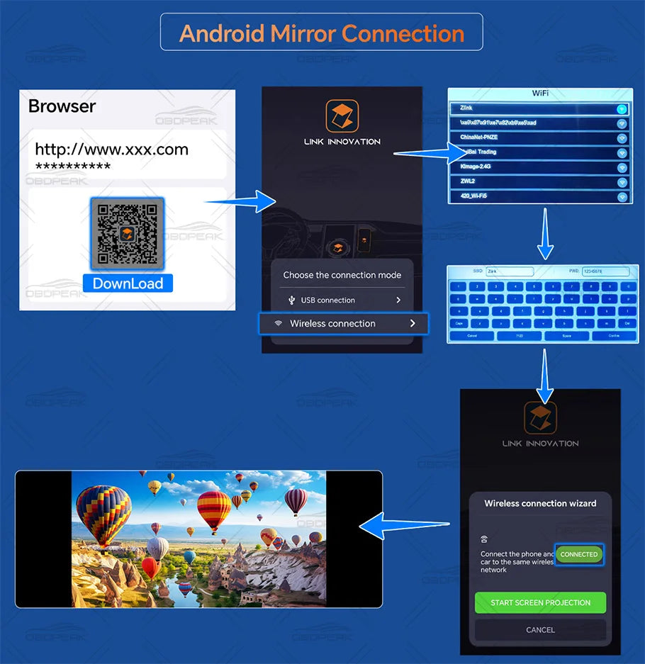 A: Select the Android Mirror device, scan the QR code to download the dedicated software, then connect to the device's WIFI and select the device screen mirroring option in the software