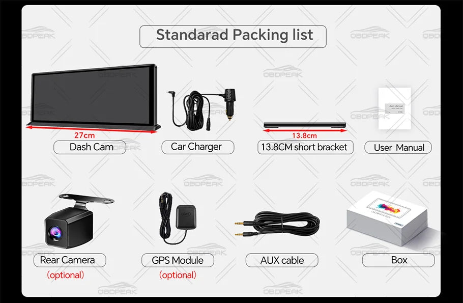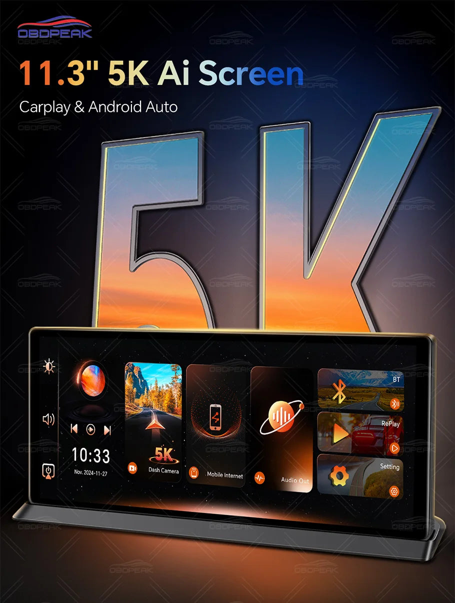 OBDPEAK K8 Pro Front 5K Rear 1080P Dash Cam Camera 11.3" Touch Ai Screen Carplay & Android Auto GPS Navigation Night Vision DVR