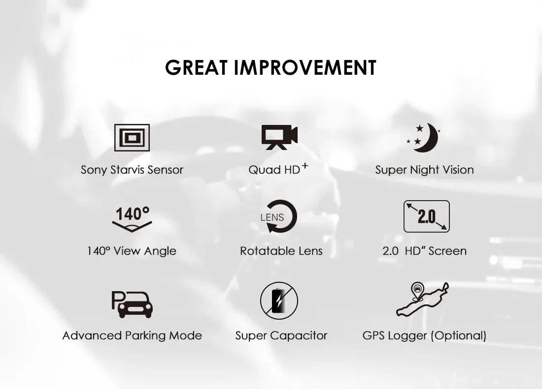 Record the road front at Quad HD+ 1600P 30fps in crystal clear video quality. Setting a video resolution of footage recorded 2560 x 1600P 30fps or 2560 x 1440P 30fps to achieve better image quality among the A119 series.