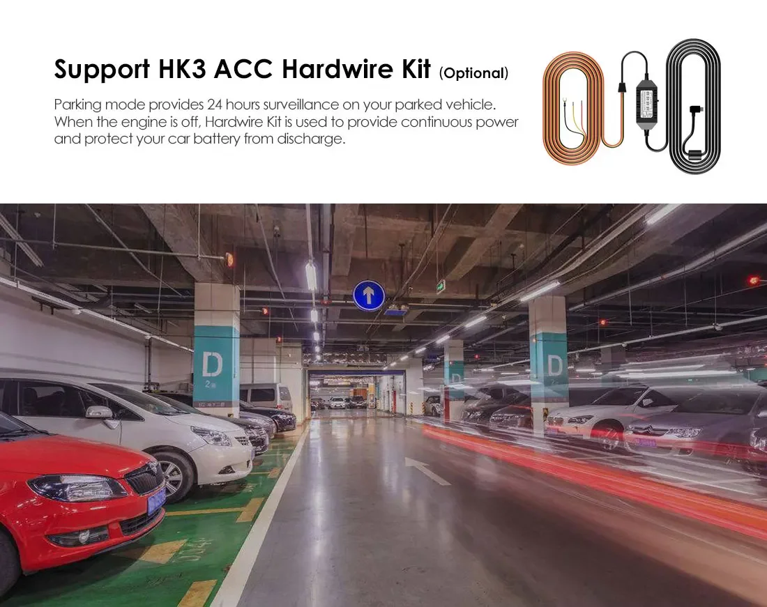 Parking mode provides 24 hours surveillance on your parked vehicle. When the engine is off, Hardwire Kit is used to provide continuous power and protect your car battery from discharge.