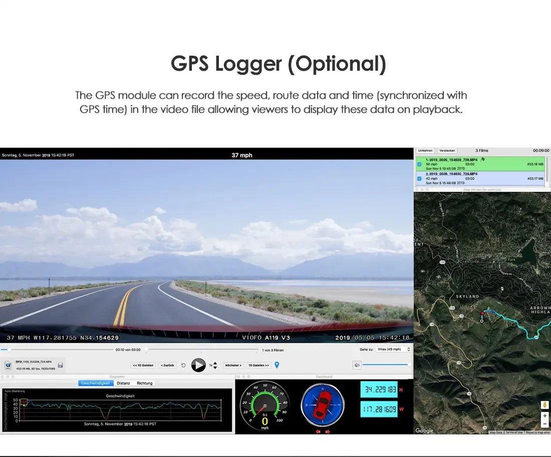 The GPS module can record the speed, route data and time (synchronized with GPS time) in the video file allowing viewers to display these data on playback.