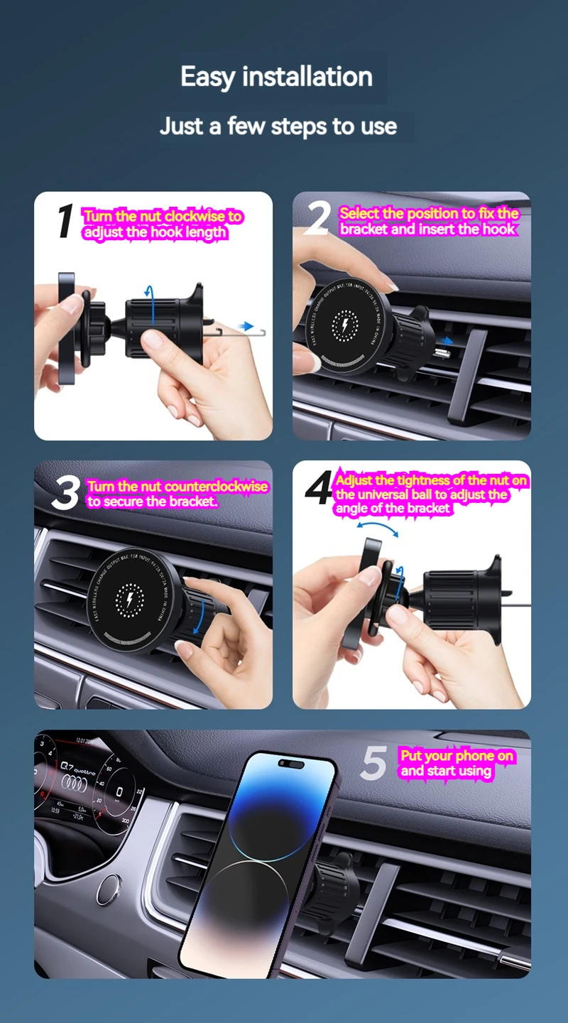 Compatible with a wide range of devices, including the latest iPhone 16 and Samsung models, this charger holder is a versatile accessory that caters to all your charging needs. The 15W fast charging capability ensures that your phone will always be charged up and ready to go whenever you need it.