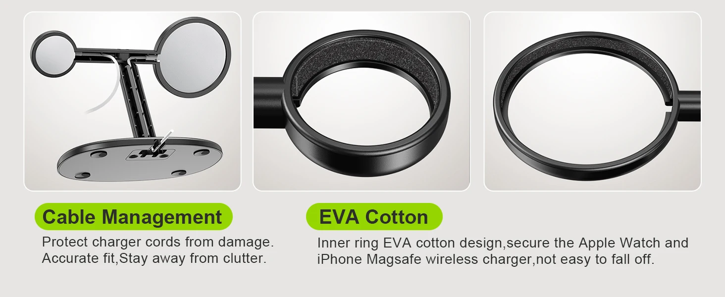【Anti-Scratch Protection & Cable Management】Soft EVA inner rings protect MagSafe and Apple Watch chargers from scratches. Hidden cable channels organize wires neatly behind the stand—eliminate cable clutter on desks or countertops.