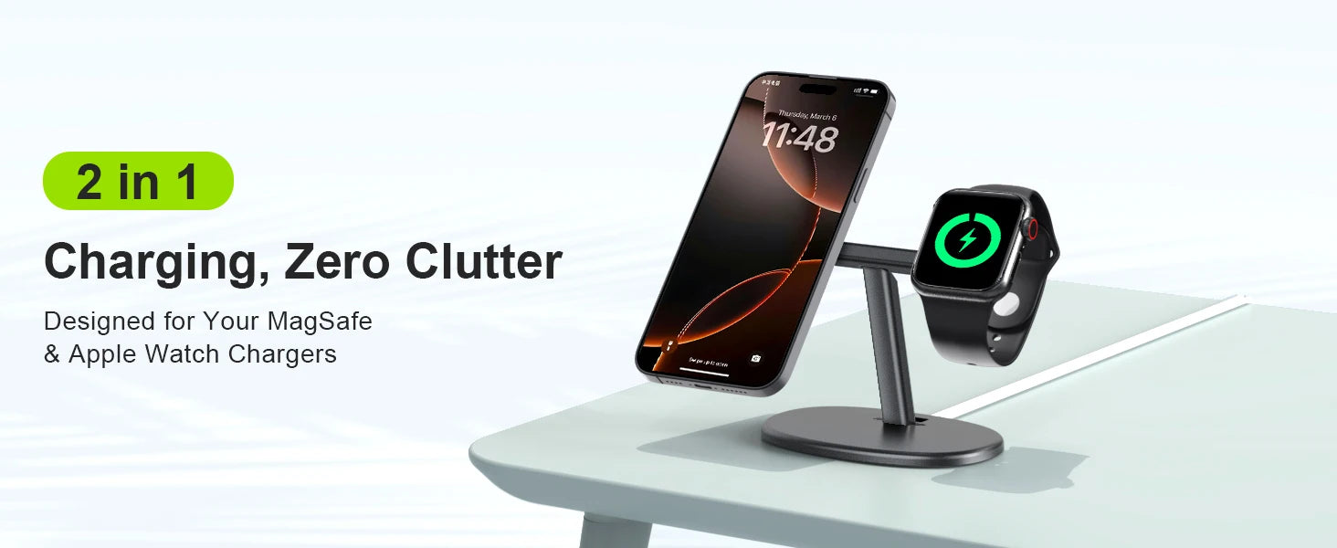 【All-in-One Charger Stand for Apple Users】Securely holds your MagSafe and Apple Watch chargers (sold separately). Charge iPhone and Apple Watch side-by-side. Ideal for those who want to use their original Apple MagSafe to charge both their iPhone and Apple Watch on a single stand.