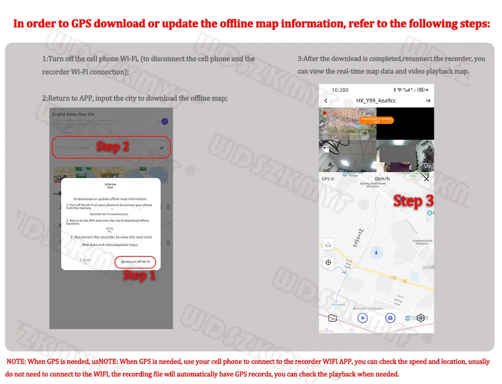 In order to GPS download or update offline map information, the first time you connect to the recorder WIFI and open the APP, refer to the following steps: