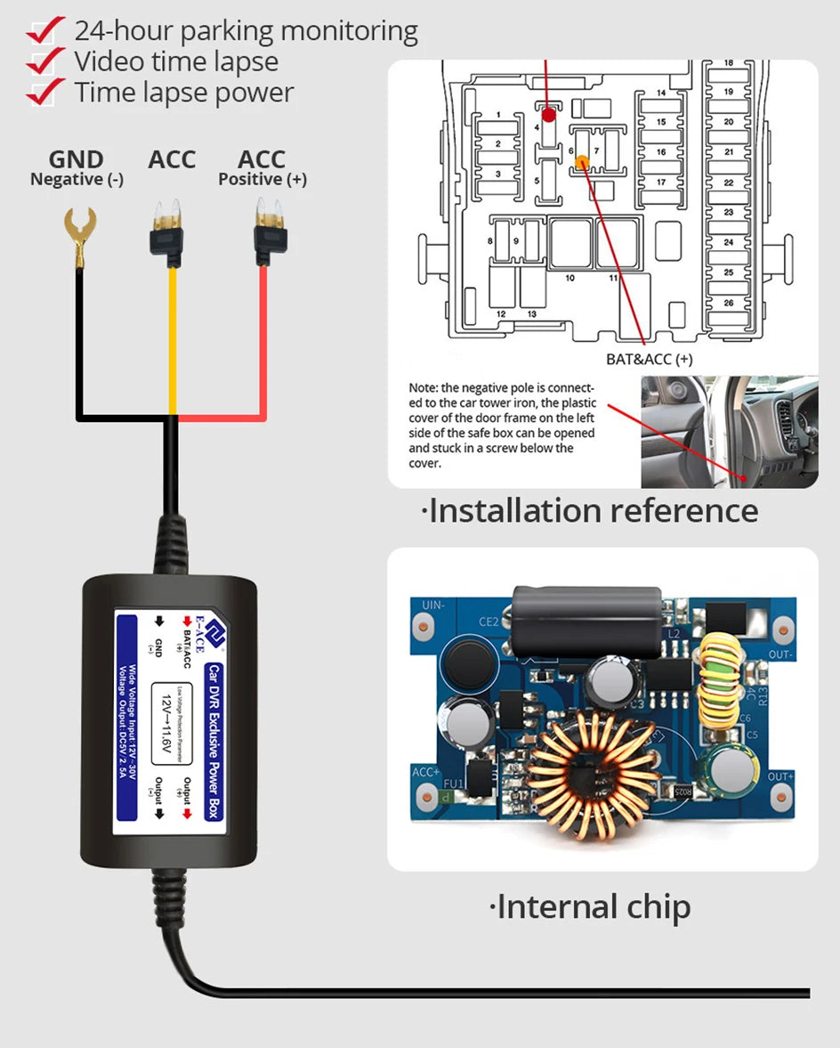If you want to stop monitoring after parking (the DVR does not work after parking), connect the positive pole of the buck line to the fuse box ACC interface.