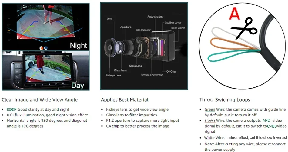 *AHD1080P parking camera: 1920*1080P resolution, high definition, IP68 waterproof, works normally in car wash or bad weather, fantastic starry sky night vision effect.
