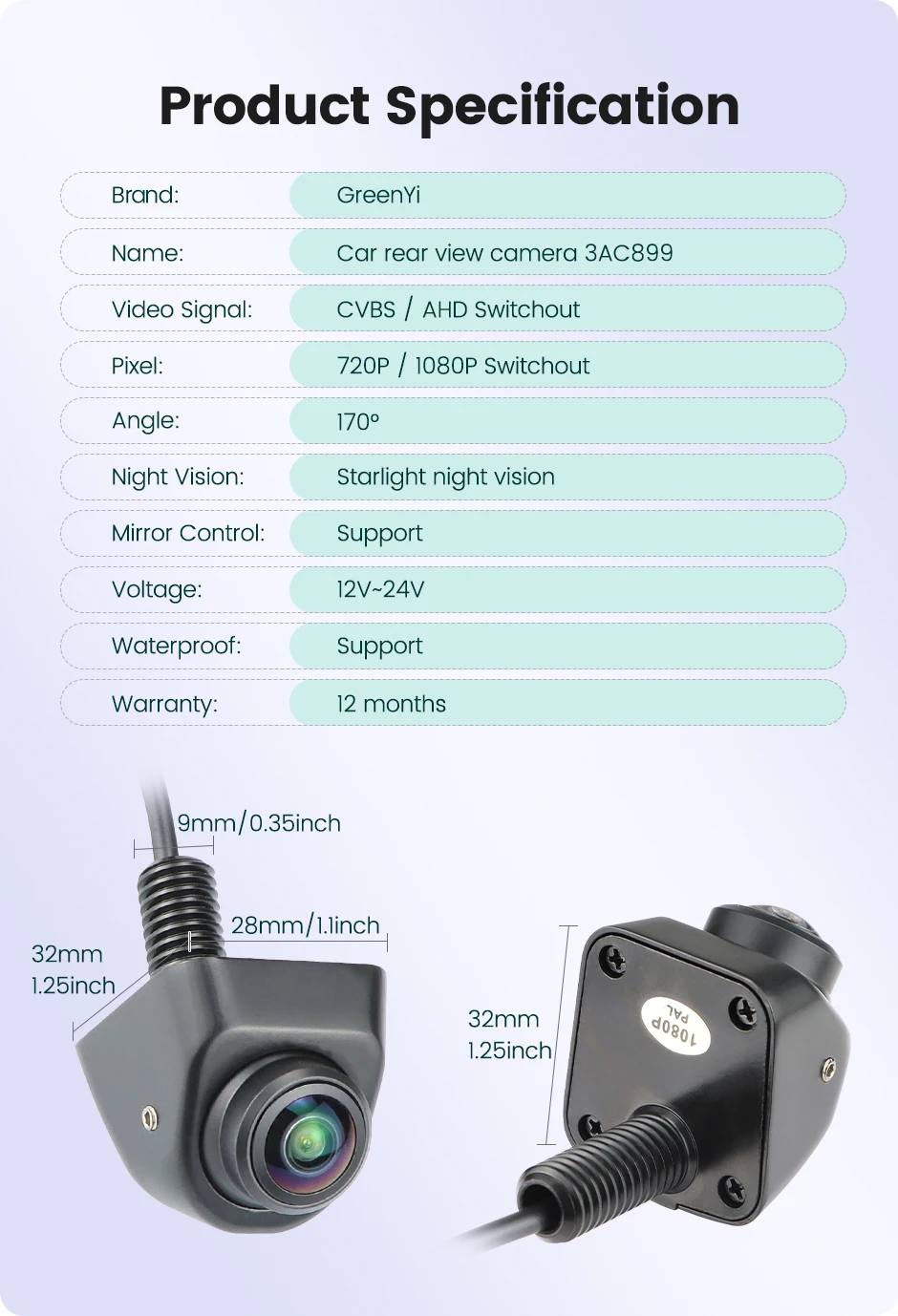 GreenYi 360° Adjustable AHD Car Rear View Camera Mini Side/Front/Backup 170° Fisheye Lens HD Night Vision Vehicle Reversing C899