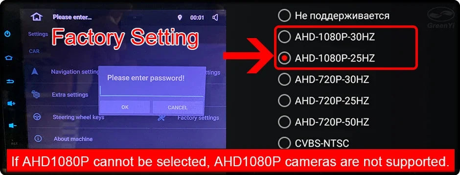 * Some cheap Android head units may also have the setting for AHD 1080P video signal , but they can't display any AHD image, because they don't support AHD at all. If so, then you can only apply CVBS video signal, hope you understand.