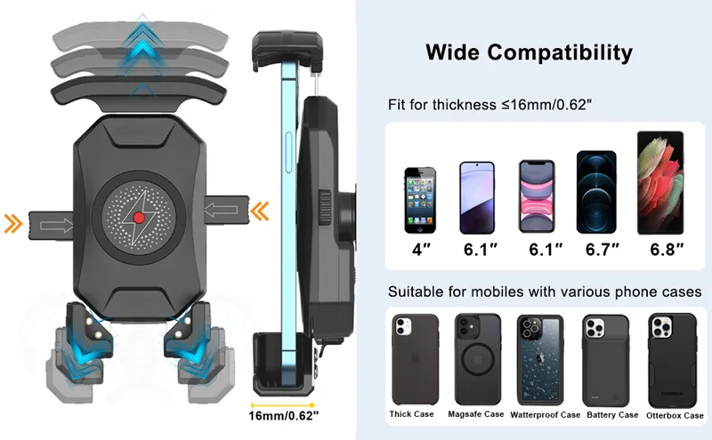 • Widely compatible Universal bicycle mobile phone holder bicycle, suitable for 4.7 and 6.8 inches, with a maximum thickness of 15mm (including mobile phone cases), such as Phone 1 2 Pro Max Mini Xs XR X 8 Plus 7 6s 6, Galaxy S10 + S10e S9 S8, Note 9, LG and other mobile phones.
